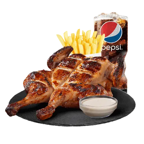 دجاجة كاملة متبّلة بالتوابل السرية، مشوية على الفحم حتى تمنح ذهباً مدخّناً حقيقياً مع بطاطس ومشروب.